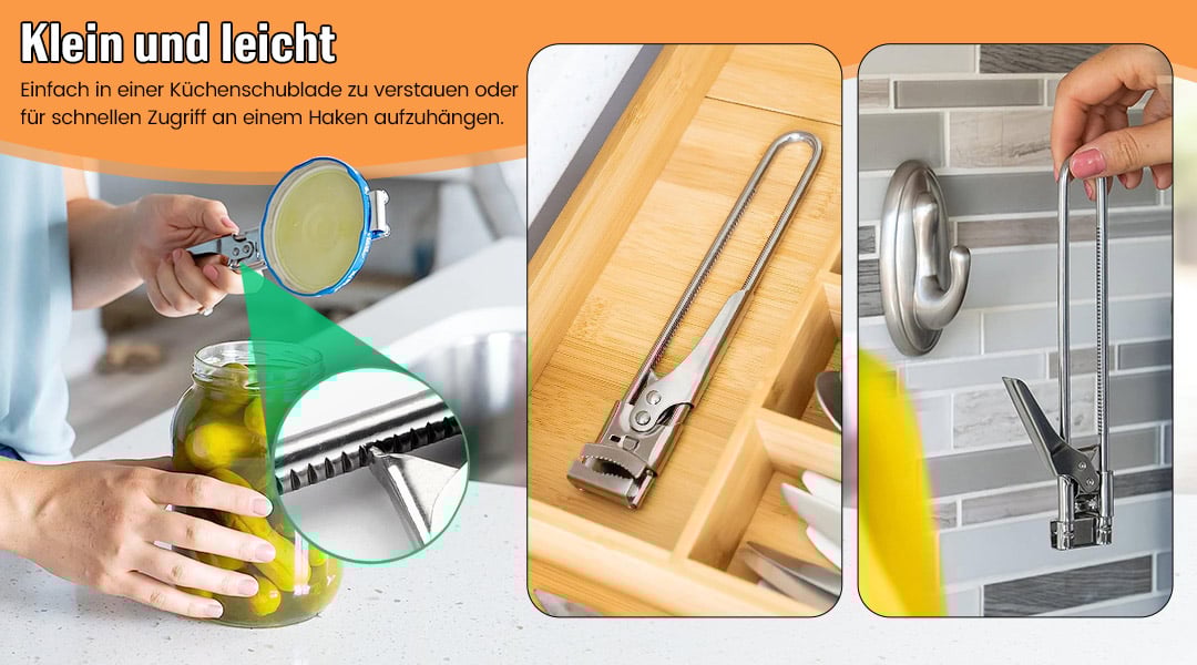 Der Glasöffner des Deckelöffners ist klein, lässt sich einfach am Haken in der Küche befestigen oder am Haken aufhängen, und die Bremse ist schnell erreichbar.